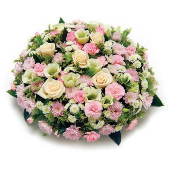 A round loose edged floral posy of cream Roses and soft pink and white mixed flowers with complementary green foliage.
