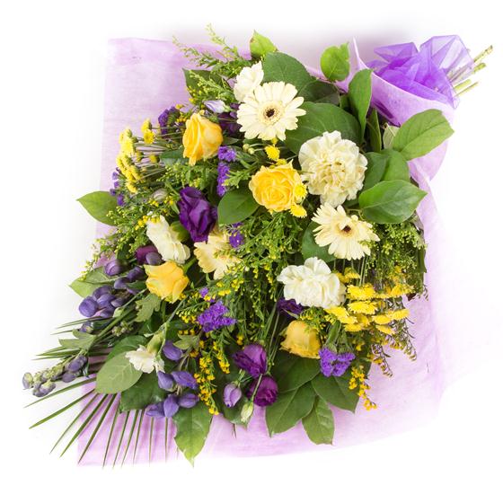 A traditional sheaf of golds and purples including roses, lisianthus, mini gerberas and solidaster.