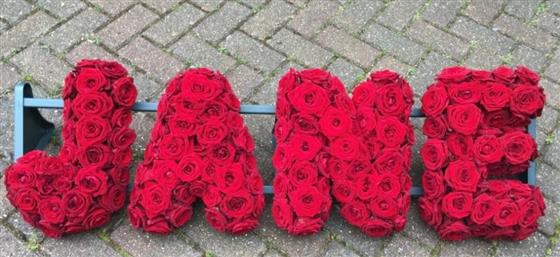 A luxurious array of roses expertly created into your loved ones name. This arrangement is filled with beautiful roses to give your lettered tribute that extra special touch. *please note this price is per letter - please choose the amount of letters required and please tell us which word you would like us to create