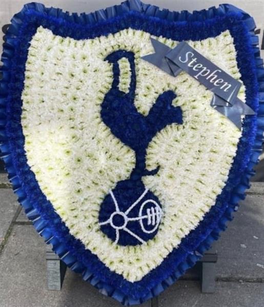 This Tottenham Hotspur Crest is created using based Chrysanths, ribbon edge and can be made with or without the named ribbon.