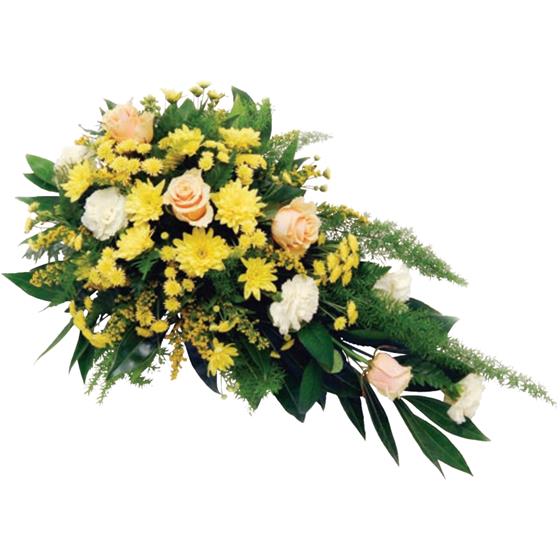 A single-ended spray of lemon roses and mixed yellow and cream flowers with complementary green foliage.
